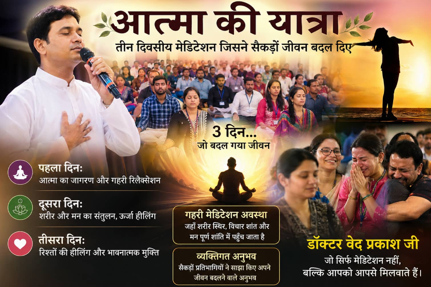 🌿 “आत्मा की यात्रा: तीन दिवसीय मेडिटेशन जिसने सैकड़ों जीवन बदल दिए” लेख: विशेष प्रस्तुति ✨ प्रस्तावना: बाहर जीत… अंदर हार आज का इंसान… 👉 बाहर से सफल दिखता है… 👉 लेकिन अंदर से टूटता जा रहा है… चेहरे पर मुस्कान है… लेकिन दिल में खालीपन… रिश्ते हैं… लेकिन जुड़ाव [...]