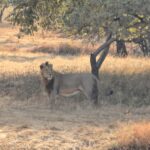 लगभग एक घंटे तक सफारी में घूमने के बाद, हमें सबसे रोमांचक दृश्य देखने को मिला—शेर शिकार की मुद्रा में था! उसने एक हिरण पर नज़र गड़ा रखी थी और धीरे-धीरे उसके करीब जा रहा था। दूसरी ओर, हिरण भी पूरी तरह सतर्क था। यह दृश्य किसी नेशनल जियोग्राफिक डॉक्यूमेंट्री से कम नहीं था, लेकिन यह हमारी आंखों के सामने हो रहा था!