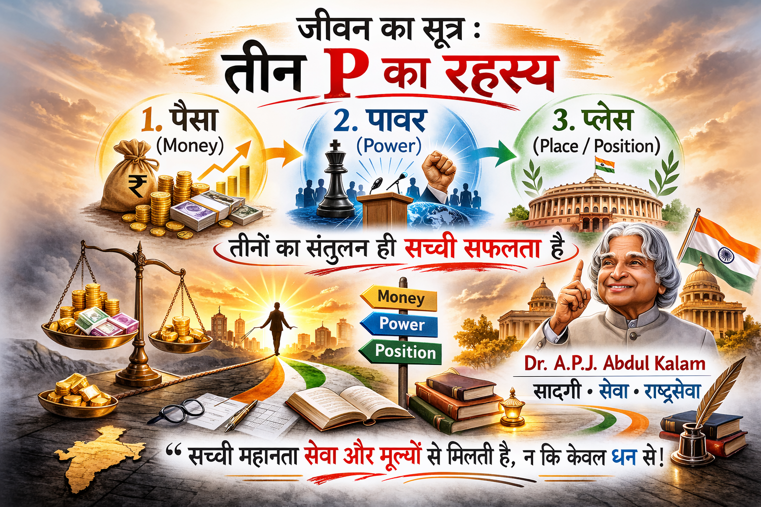 डॉ. कलाम जी ने देश के सर्वोच्च संवैधानिक पद — राष्ट्रपति पद — को सुशोभित किया। उनके पास राष्ट्र स्तर की प्रतिष्ठा (Place) और नैतिक प्रभाव एवं शक्ति (Power) दोनों थे। फिर भी उन्होंने व्यक्तिगत धन-संपत्ति या भौतिक वैभव को कभी महत्व नहीं दिया। जीवन भर सादगी, ज्ञान और राष्ट्रसेवा को ही अपना उद्देश्य बनाए रखा।